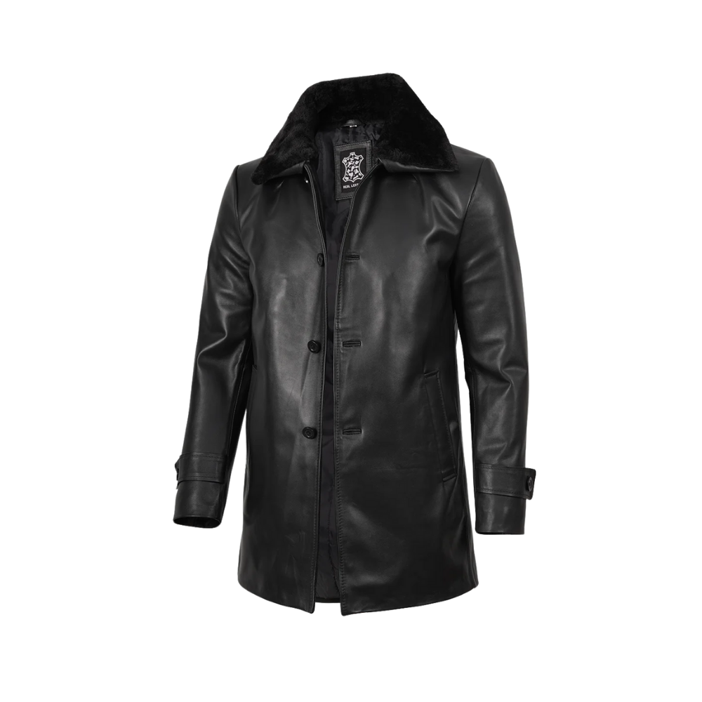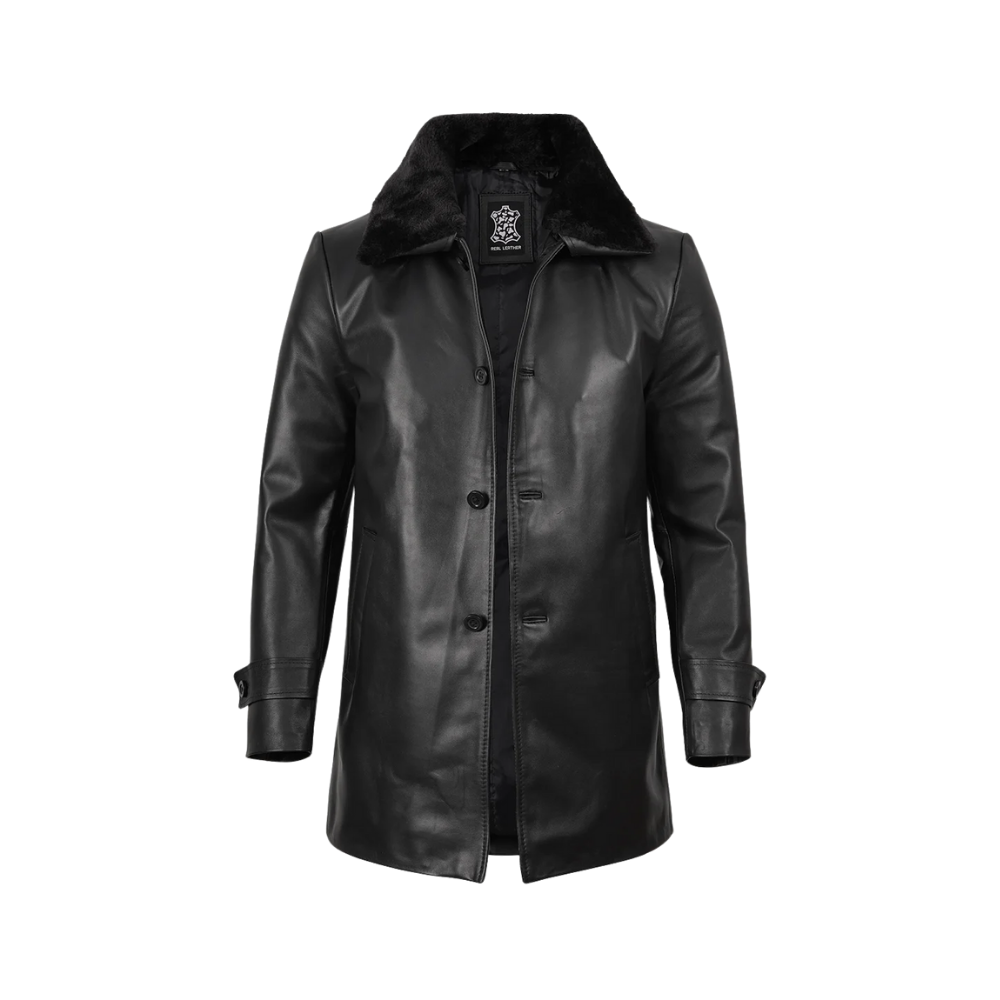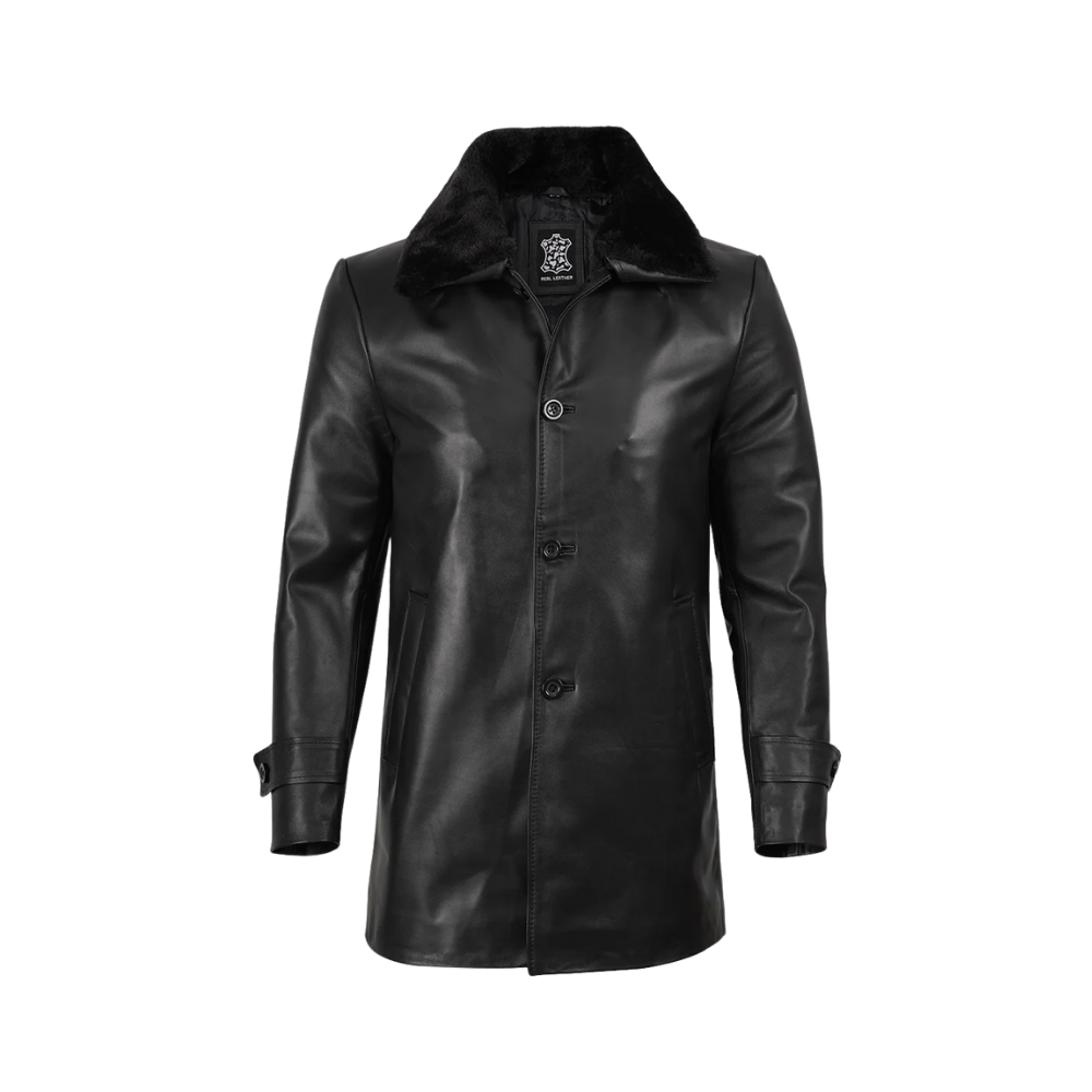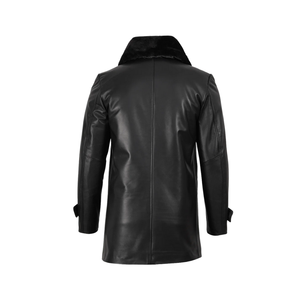 Stay cozy in elevated style with this black 3/4-length leather coat for men. Featuring a plush shearling collar, it delivers exceptional comfort while maintaining a sleek, polished look. Ideal for chilly days or evening wear, this timeless piece effortlessly enhances any outfit.