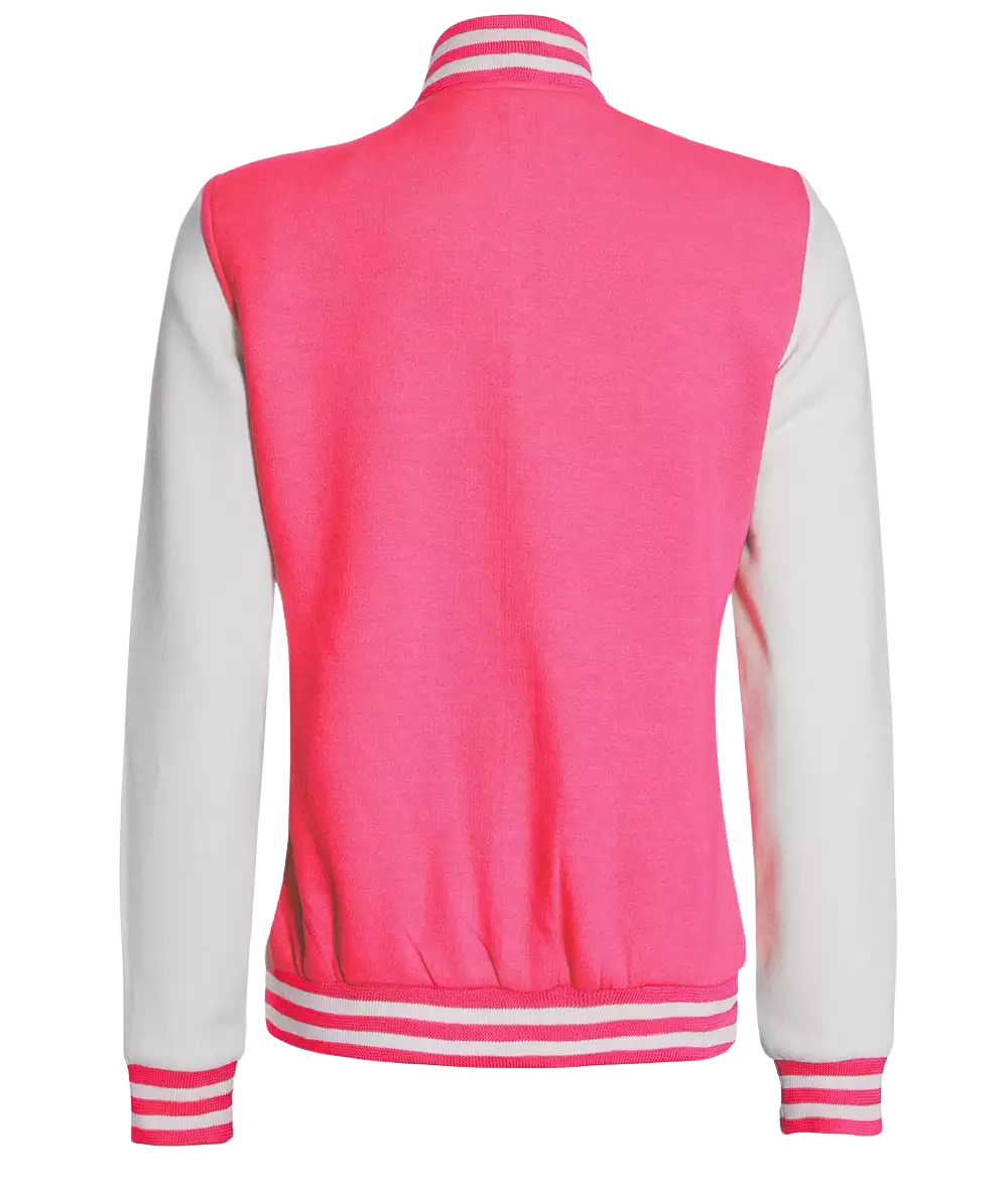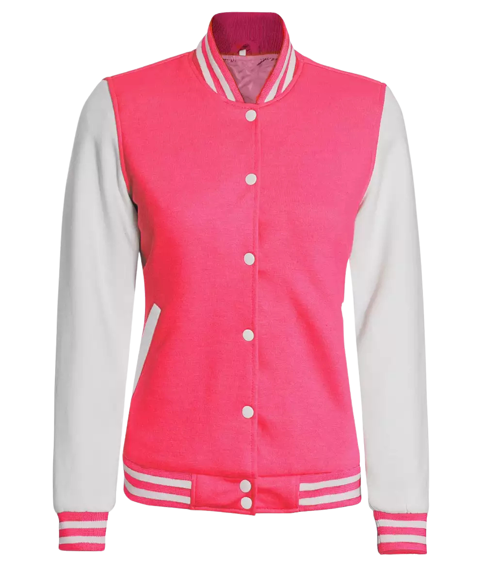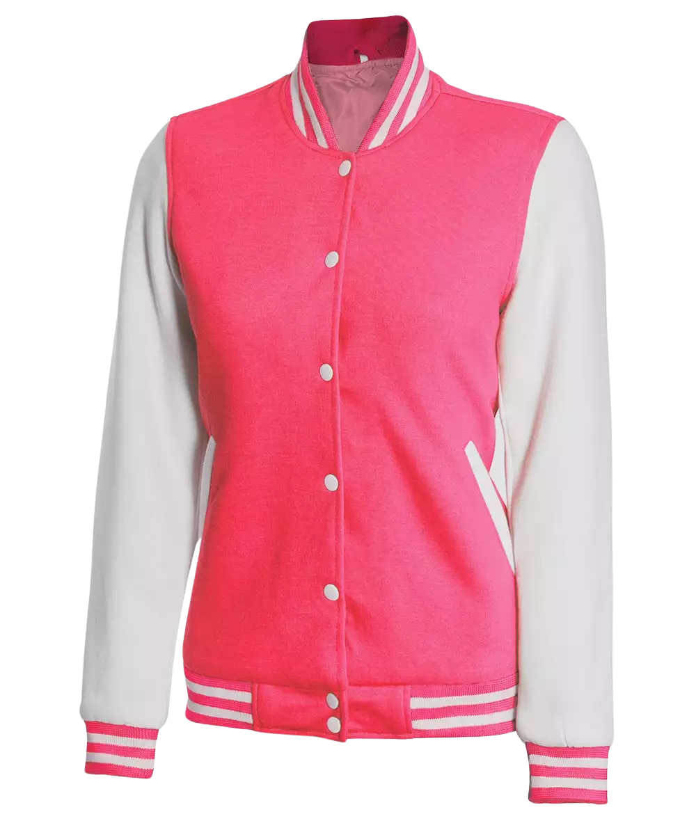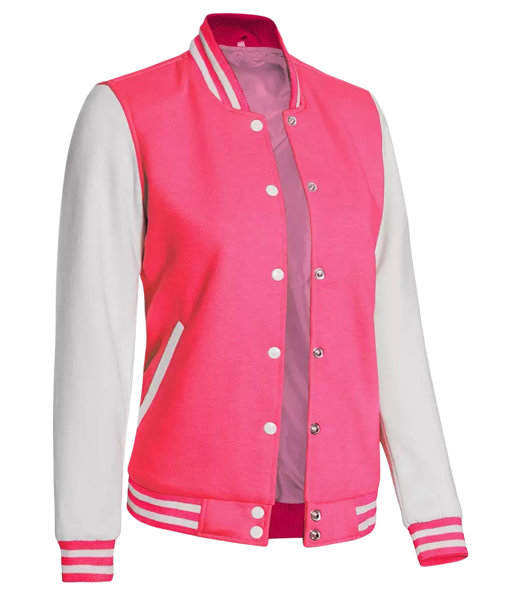 Women’s pink-white varsity jacket in baseball letterman style; soft fleece with smooth polyester lining for comfy wear. Snap-button front and two pockets; bright two-tone look for school, game day, travel, and everyday outfits.