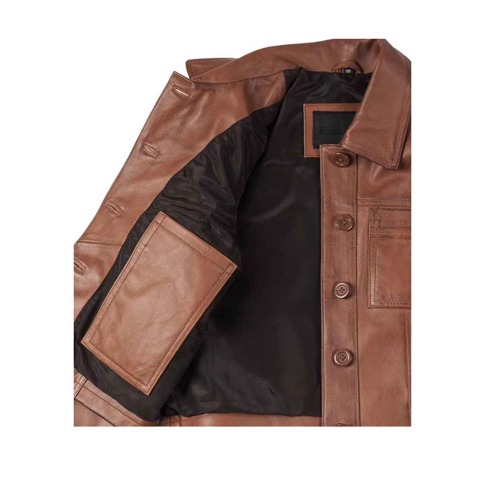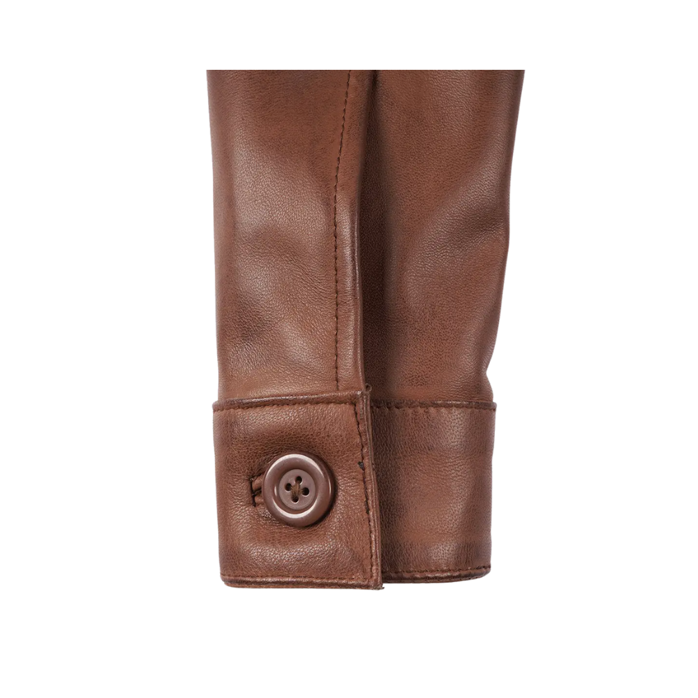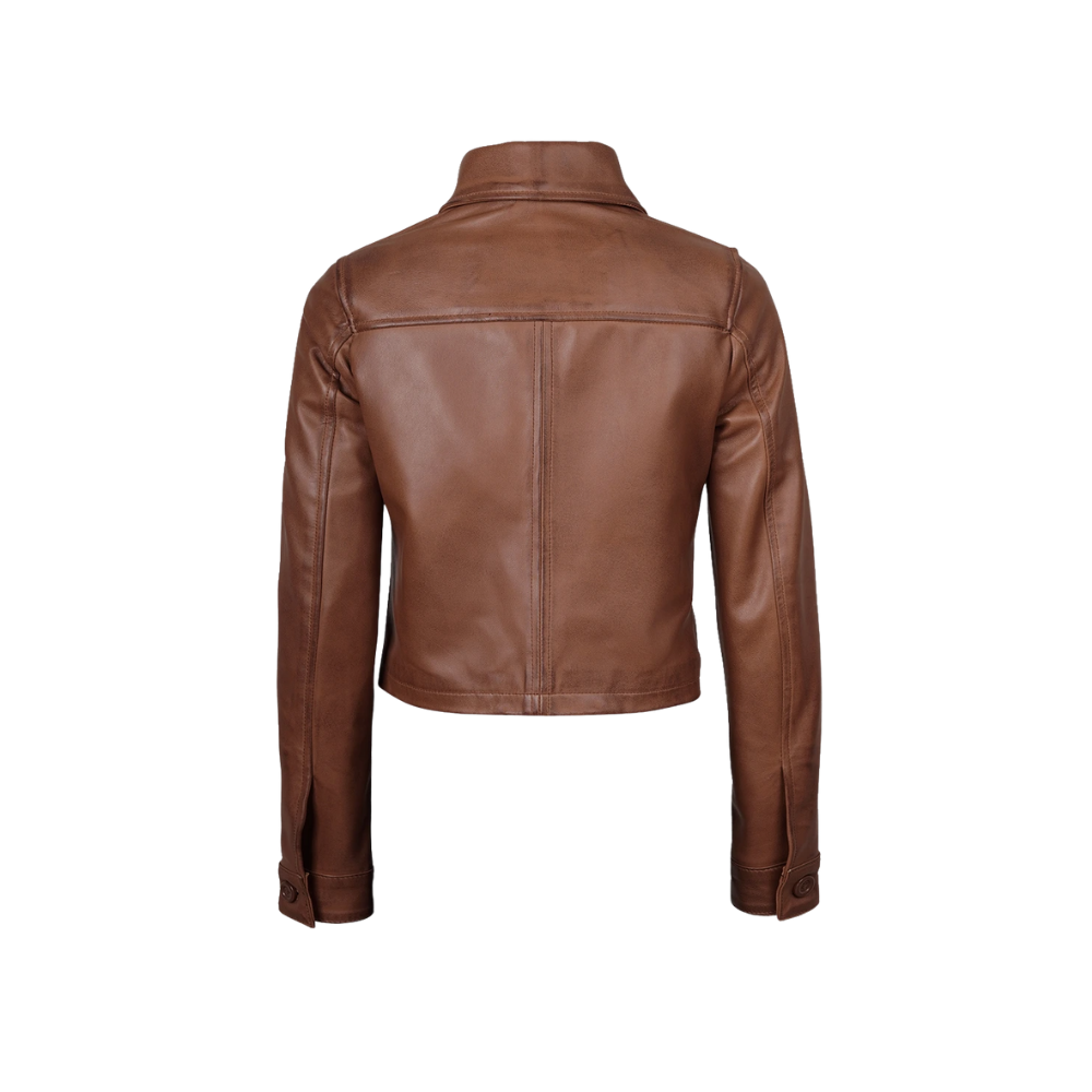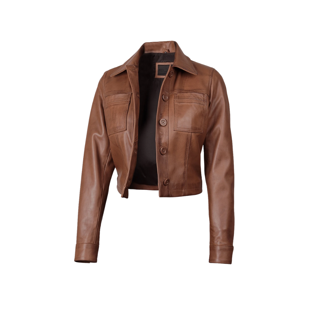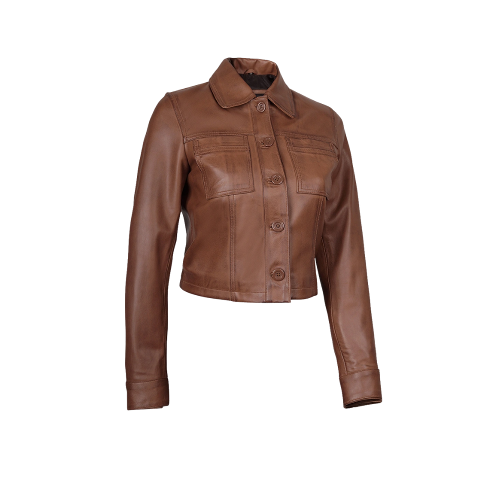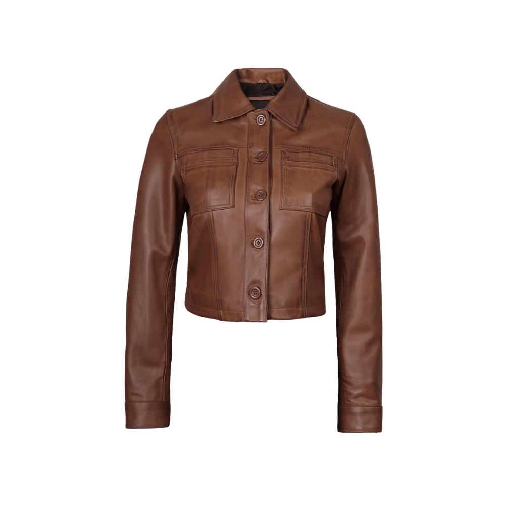 This women’s cropped cognac leather jacket blends timeless elegance with modern appeal. Made from genuine lambskin leather, it offers a tailored cropped silhouette, a sharp shirt-style collar, and a refined button-front closure. Finished with a smooth polyester lining, its sleek design makes it an effortless layering piece for both casual and elevated looks.