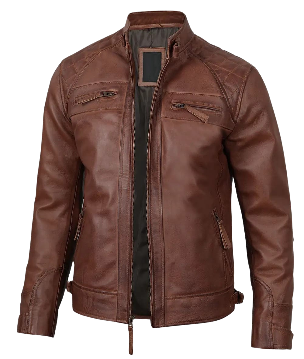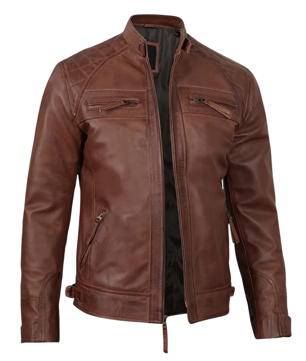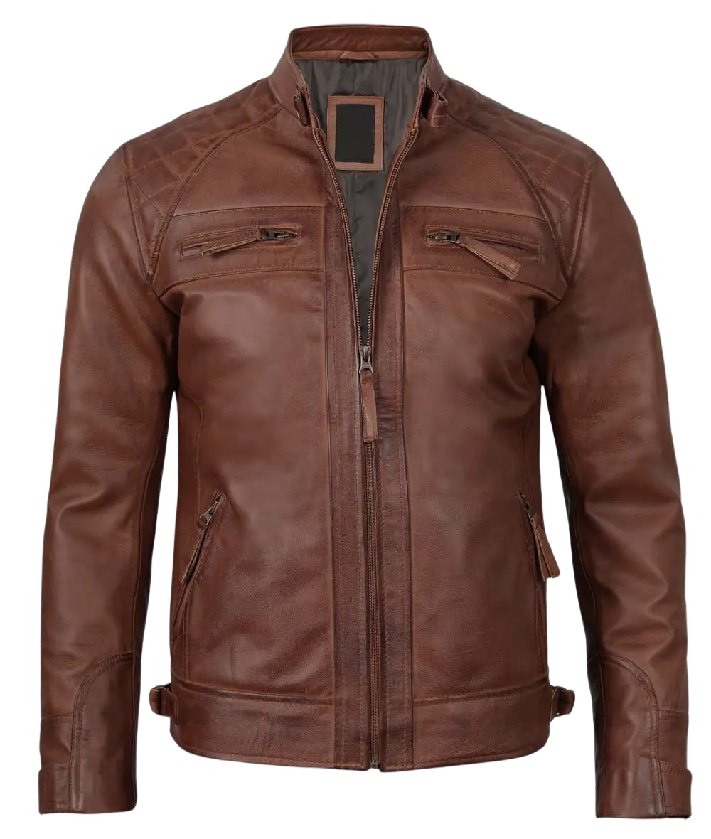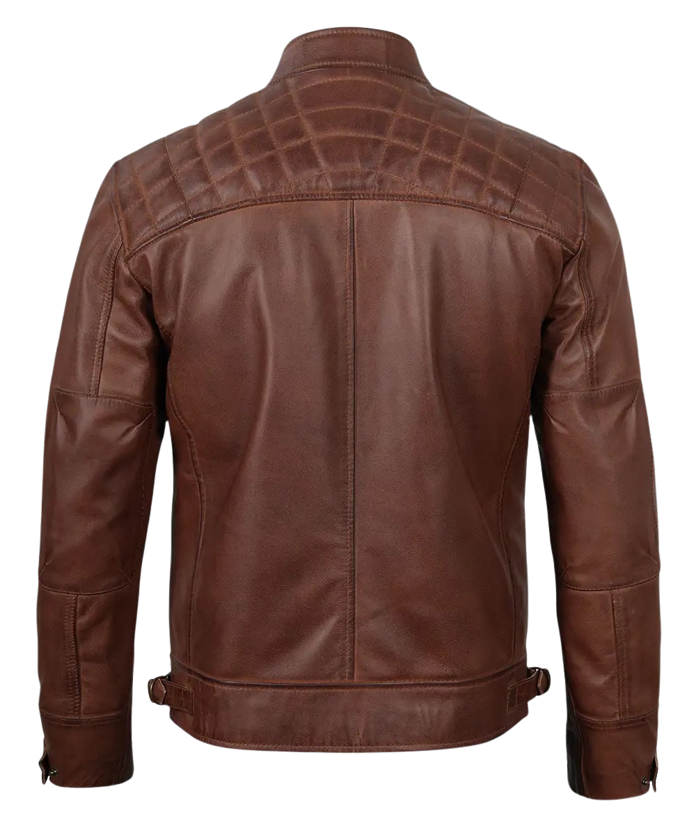 Be the first to review “Men’s Quilted Shoulder Cognac Motorcycle Leather Jacket” Cancel reply