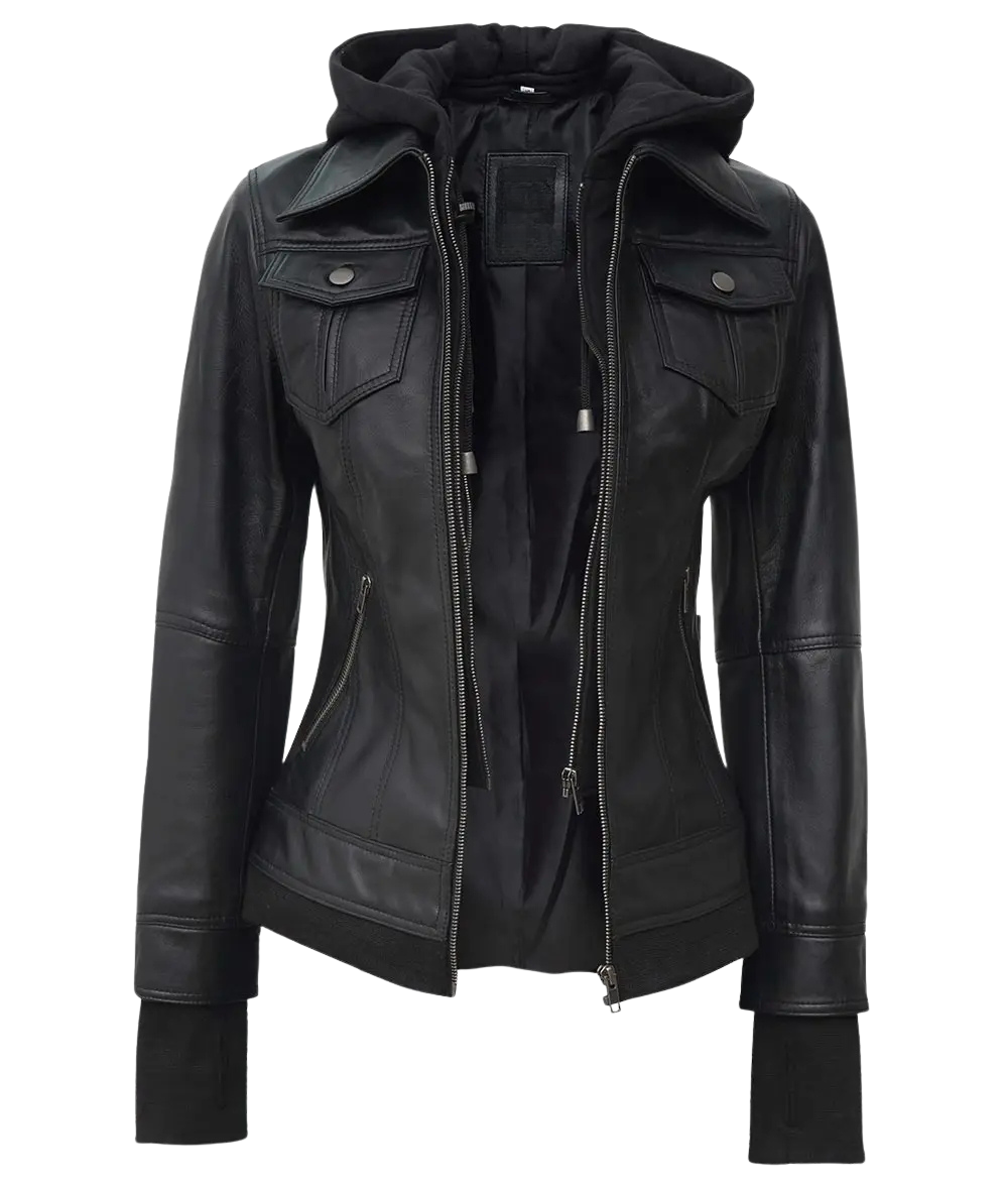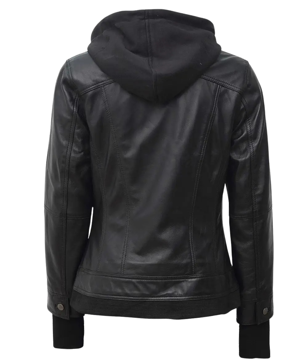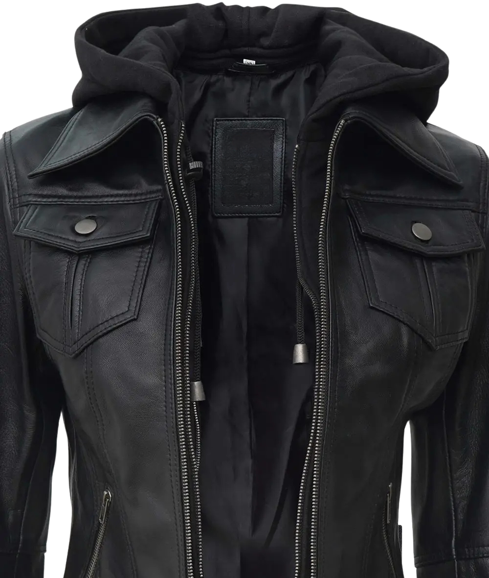 The Éloise Womens Black Bomber Leather Jacket with Removable Hood
