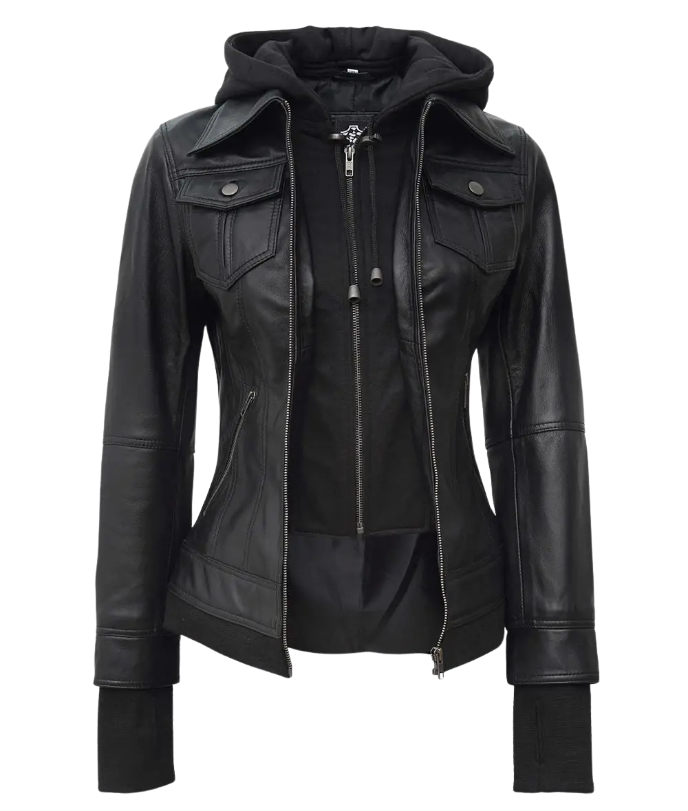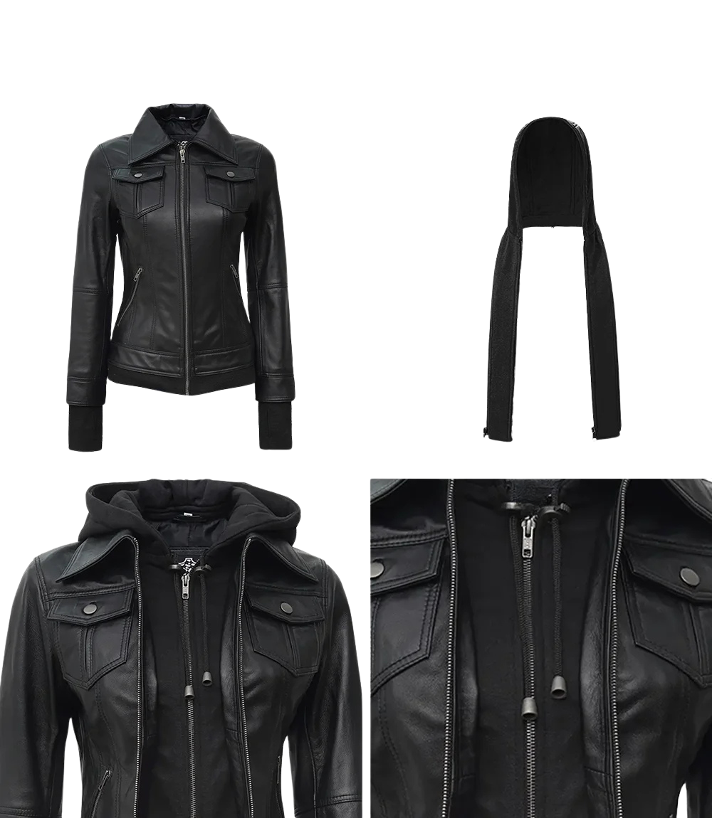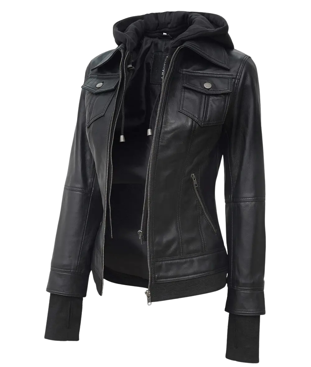 The Éloise Womens Black Bomber Leather Jacket with Removable Hood